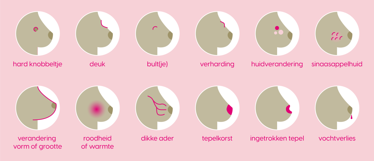 Als je je borsten leert kennen weet je wat normaal is voor jouw borsten. Hoe ze eruitzien en hoe ze voelen. Eventuele veranderingen in je borst(en) merk je dan sneller op. Houdt zo’n verandering langere tijd aan, trek dan aan de bel bij je huisarts. Bedenk dat de meeste borstafwijkingen onschuldig en goedaardig zijn. Blijf je twijfelen, ga dan (weer) naar de huisarts.